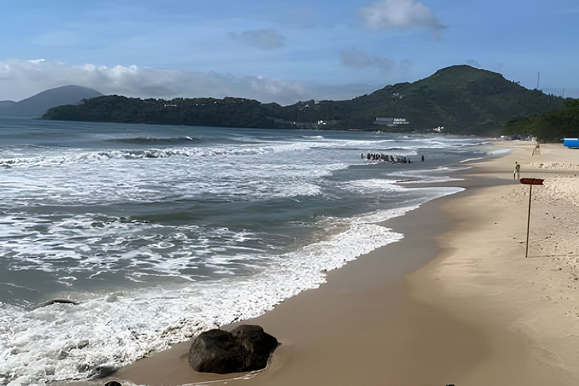 Famílias aproveitam o canto direito, com mar calmo e faixa de areia ampla;